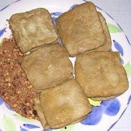 3. 炸豆腐:锅中倒入足量的油,油温升至5成热时,将腌制好的豆腐块放入锅中,炸至表面金黄,捞出沥油。